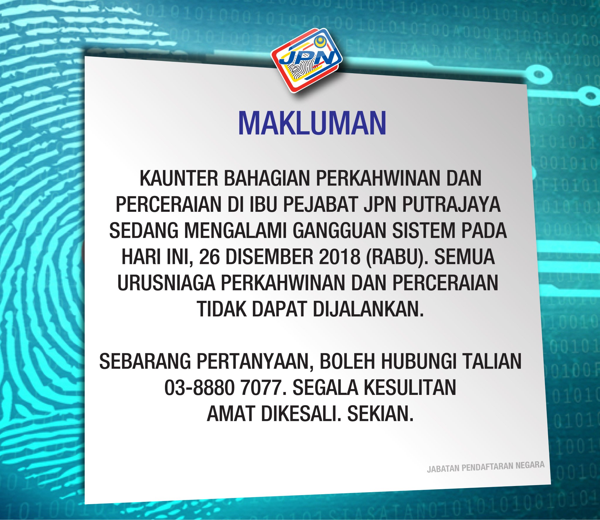 Jpn Malaysia On Twitter Makluman Gangguan Sistem Di Bahagian Perkahwinan Dan Perceraian Ibu Pejabat Jpn Putrajaya Pada Hari Ini