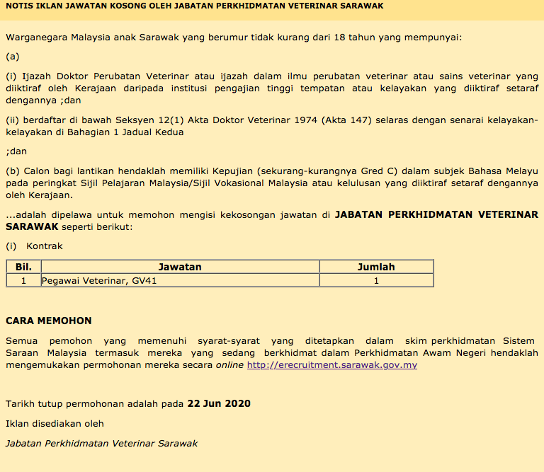 Jawatan Kosong Di Jabatan Perkhidmatan Veterinar Sarawak 22 Jun 2020 Kerja Kosong 2020 Jawatan Kosong Kerajaan 2020