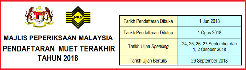 Umum sedia maklum yang memiliki keputusan muet yang cemerlang adalah amat diperlukan dalam melepasi syarat kemasukan ke universiti awam dan juga. Majlis peperiksaan malaysia kalendar muet tahun 2018 perkara muet sesi 1 sesi 2 sesi 3 tarikh pendaftaran dibuka 1 november 2017 1 mac 2018 1 jun 2018 tarikh pendaftaran ditutup 10 januari 2018 9 mei 2018 1 ogos 2018 tarikh ujian speaking 27 28 februari dan 1 5 6 7 mac 2018. 10 januari 2018 tarikh ujian speaking. 1 november 2017 tarikh tutup pendaftaran.