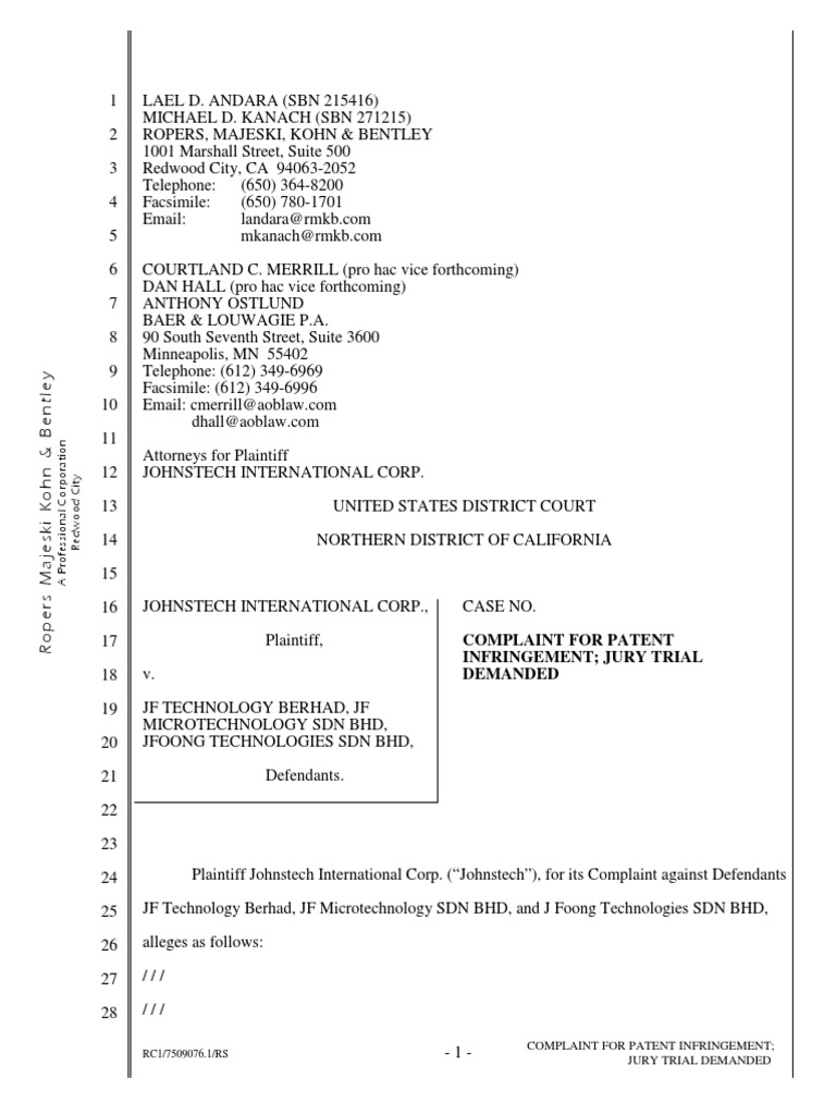 Johnstech International V Jf Technology Berhad Et Al Patent Infringement Complaint