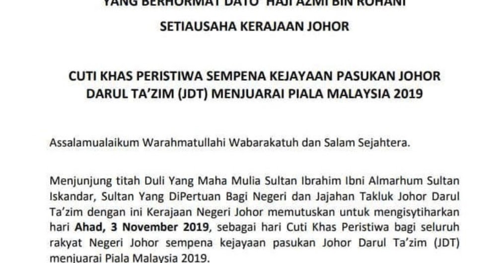 Mysumber Official On Twitter Kenyataan Rasmi Kerajaan Johor Telah Mengumumkan Cuti Khas Peristiwa Pada Ahad 3 November 2019 Sempena Menjuarai Piala Malaysia 2019 Pialamalaysia2019 Pialamalaysia Jdt Luaskankuasamujohor Https T Co C6tr9g3mox