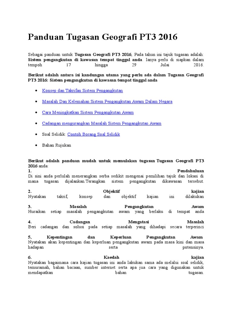 Bahan rujukan senaraikan semua bahan rujukan yang digunakan untuk kajian tugasan ini tugasan geografi pt3 tahun 2015. Huraian kaedah kajian tugasan geografi pt3. Berikut adalah contoh kerja kursus geografi pt3 sistem pengangkutan yang dapat dijadikan panduan dan rujukan kepada pelajar semua menyiapkan kerja kursus folio geografi pt3 2016. Contoh kerja kursus geografi pt3 sistem pengangkutan.
