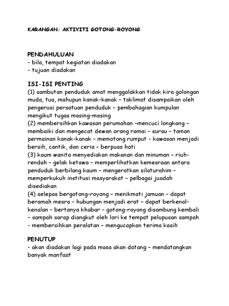 Karangan aktiviti gotong royong. At july 18 2019. Amalan ini merupakan budaya yang dipraktikkan sejak generasi dulu dan amalan ini dianggap tak basah dek hujan tak lekang dek panas. Karangan gotong royong di sekolah dalam meniti kehidupan yang bertunjangkan nawaitu materialistik dan individualistik marcapada ini kita seyogianya memahami maksud amalan bergotong royong. Beliau mengatakan bahawa tujuan aktiviti gotong royong ini diadakan adalah untuk membersihkan sekitar kawasan perumahan kami agar kami hidup dalam suasana yang bersih sihat dan ceria.