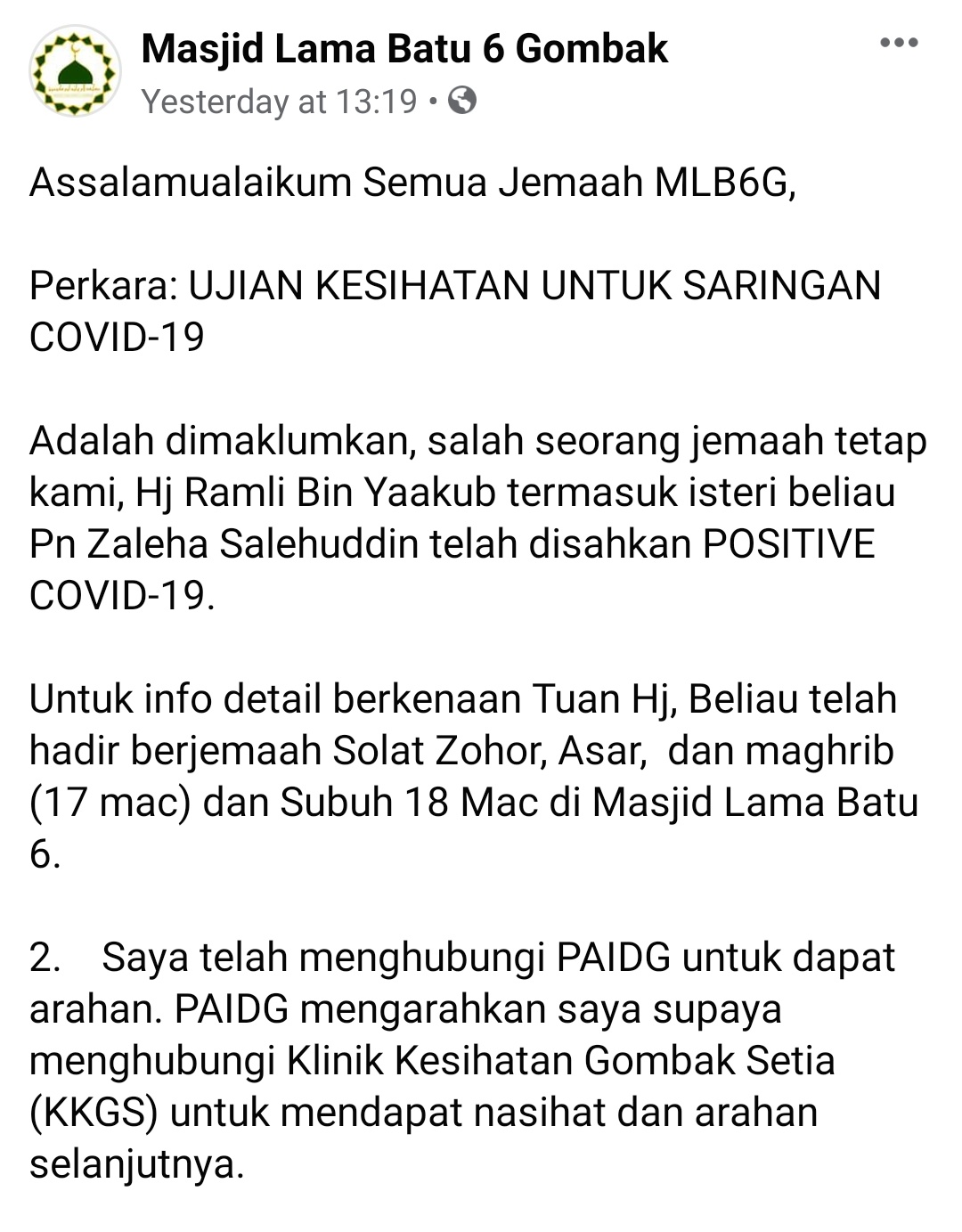 Asal Gombak On Twitter Jemaah Masjid Lama Batu 6 Positif Covid 19 Semalam Seorang Jemaah Tetap Di Masjid Lama Batu 6 Jalan Gombak Telah Disahkan Positif Covid 19 Bagi Sesiapa Yang Disyaki Mempunyai Contact