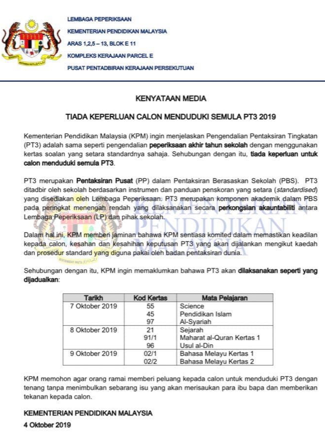 Jadual Waktu Peperiksaan Pt3 2019 Pendidikan Malaysia