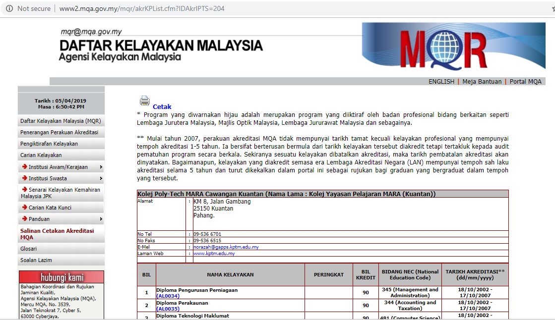 Kolej Poly Tech Mara Cara Semak Akreditasi Kptm Kuantan Di Mqa
