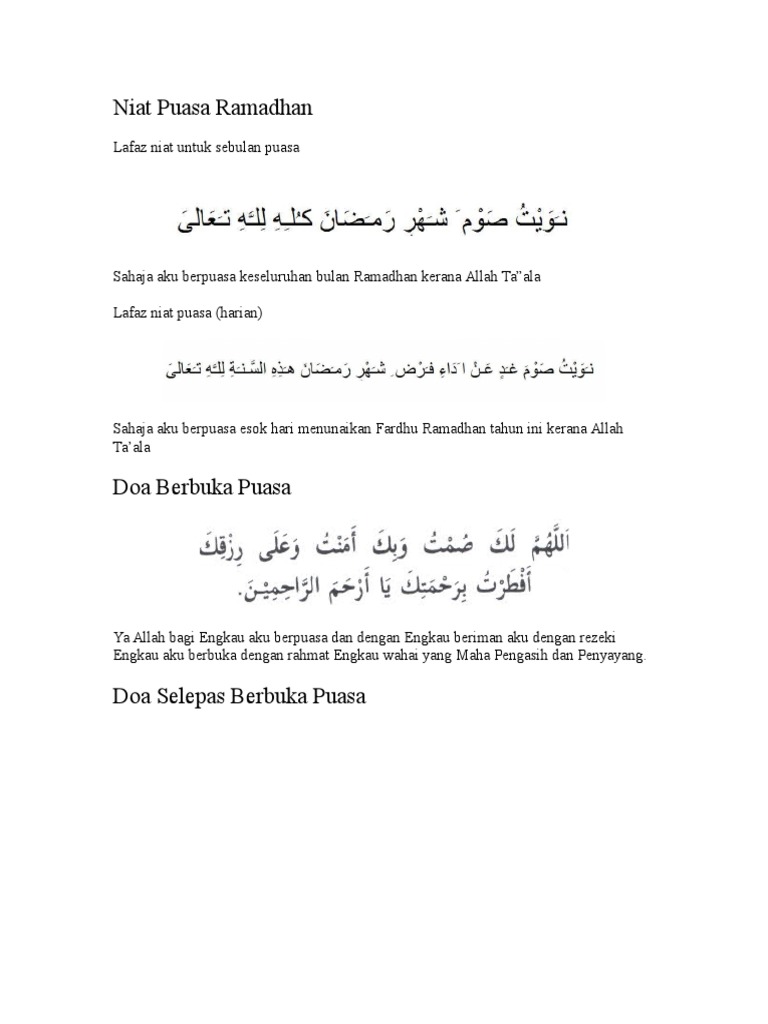 Cara lafaz niat puasa bulan ramadhan harian dan sebulan. Puasa ganti qada adalah bagi menggantikan puasa ramadan ditinggalkan serta panduan niat menunaikan puasa enam serta penjelasan dan hukum menggabungkan puasa qadha ramadan dengan puasa 6 syawal serentak. Ia disertakan bacaan dalam rumi jika anda tidak boleh membaca tulisan arab. Hal ini karena allah swt akan melipatgandakan pahala bagi siapa saja yang melakukan kebaikan dan amalan di bulan suci ramadhan.