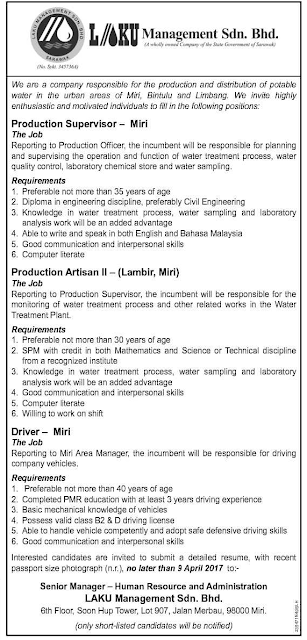 Jawatan Kosong Di Laku Management 6 Aug 2016 We Are A Company Responsible For The Production And Distribution Of Potable Wa Management State Government Job Description